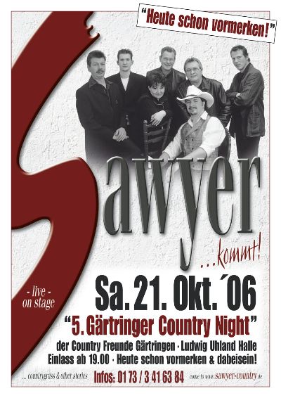 Für die Country-Freunde-Gaertringen e.V. Jochen "Blacky" Schwarz: ----------------------------------------------------------------------------------------------------------------------------- Die 5. Gärtringer Country-Night findet am 21. Oktober 2006 statt. Einlass ist ab 19.00 Uhr. Dieses mal haben wir die Gruppe SAWYER zu Gast, mehr Infos unter "Aktuell"